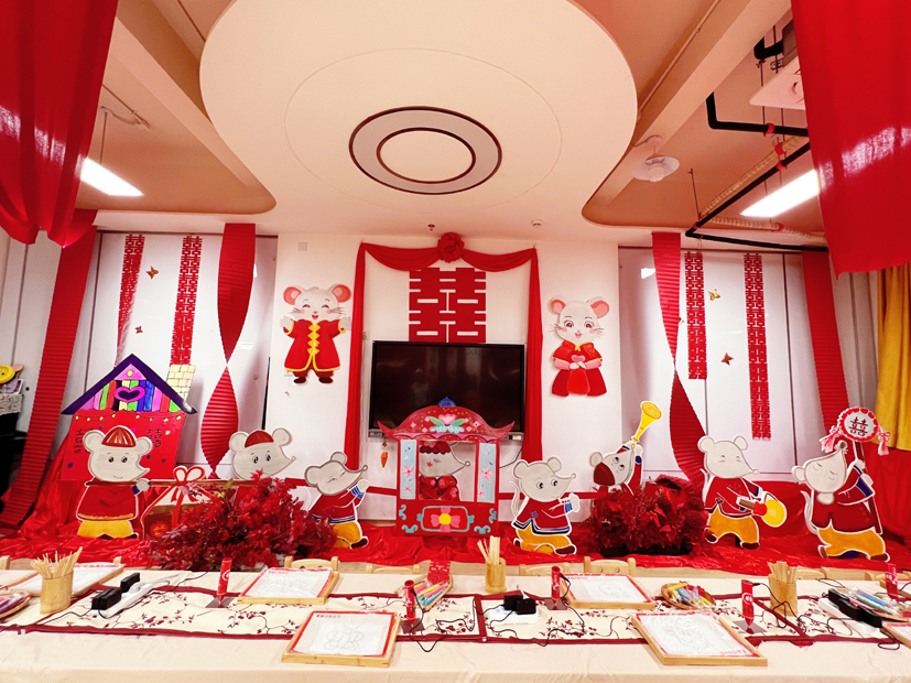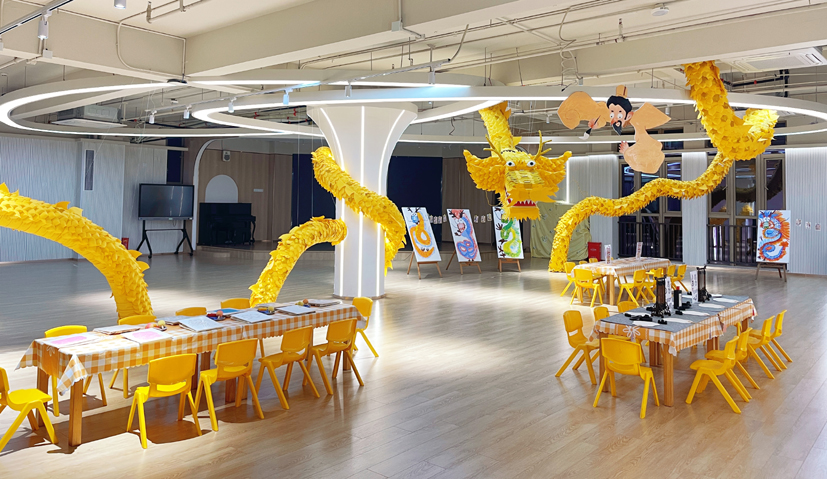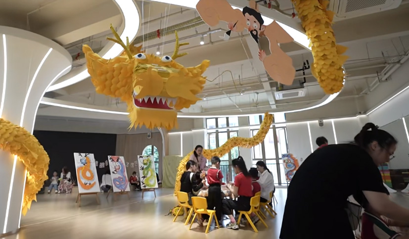 看,哪里來(lái)的鑼鼓聲,這么熱鬧,原來(lái)是小孩子喜氣洋洋,抬起了花轎。這個(gè)區(qū)域非常熱鬧,紅紅火火。抬花轎這個(gè)游戲出自《老鼠嫁女》繪本。由小朋友來(lái)演繹,有一番特別的滋味。有一個(gè)小朋友說(shuō),這是她第一次抬轎子,她的感受是要合作,轎子才會(huì)穩(wěn)。四個(gè)人抬轎子,一定要齊心協(xié)力,才能夠穩(wěn)當(dāng),小朋友在游戲中學(xué)到了知識(shí)。那么,這么有趣的小游戲是怎么設(shè)計(jì)出來(lái)的?據(jù)幼兒園老師胡夢(mèng)佳介紹,平時(shí)和小朋友一起學(xué)習(xí)的時(shí)候,發(fā)現(xiàn)小孩子對(duì)《老鼠嫁女》這個(gè)繪本非常感興趣,里面有喜字,還有花轎,都是小孩子非常感興趣的,于是我們剛好通過(guò)六一繪本游樂(lè)活動(dòng),就結(jié)合起來(lái)了,讓孩子們感受傳統(tǒng)的嫁娶儀式,經(jīng)典與童趣結(jié)合在一起,感覺(jué)非常棒!在“畫(huà)龍點(diǎn)睛”尋龍記游園館內(nèi),一條金燦燦的祥龍吸引住了小朋友,里面所有的內(nèi)容都與龍有關(guān)。小朋友手中拿的也都是與龍有關(guān)的各種手工作品,有水墨畫(huà)龍的扇子,有拓印著龍的圖案的手工布袋,還有這個(gè)五顏六色的手工祥龍等等。